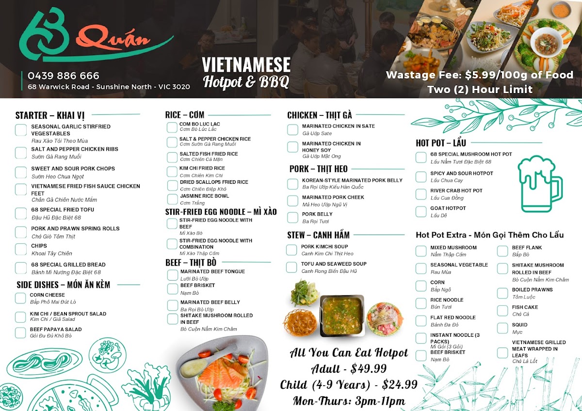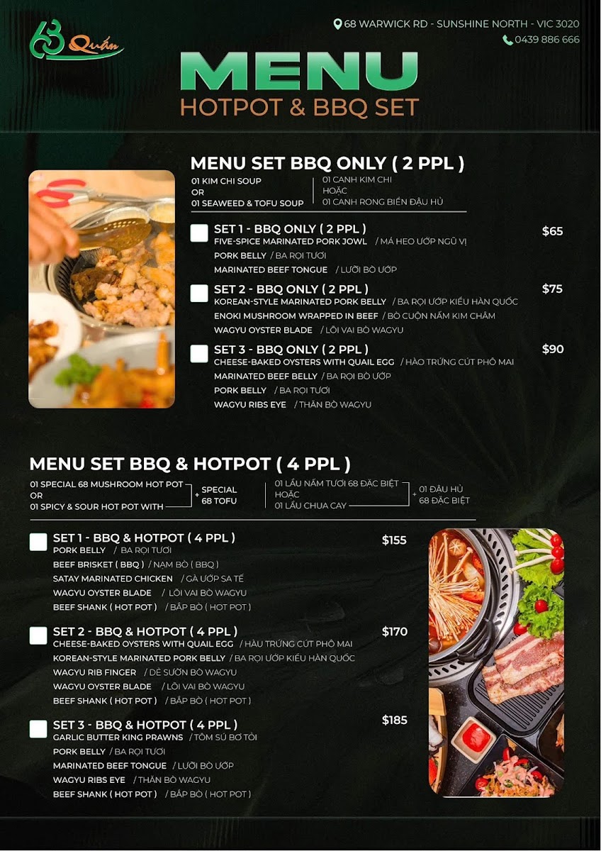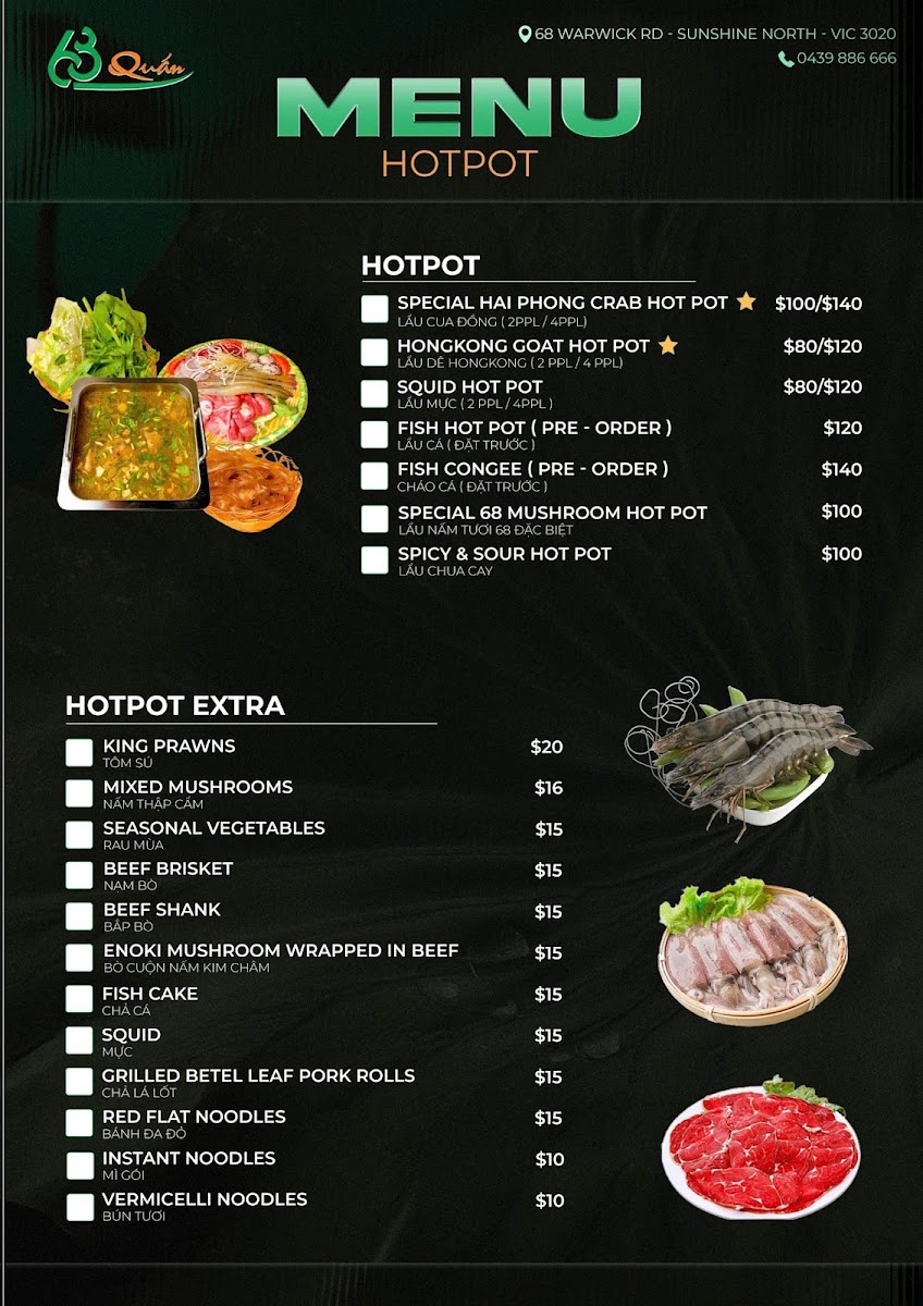68 Quán - Vietnamese Hot Pot & BBQ Restaurant Menu