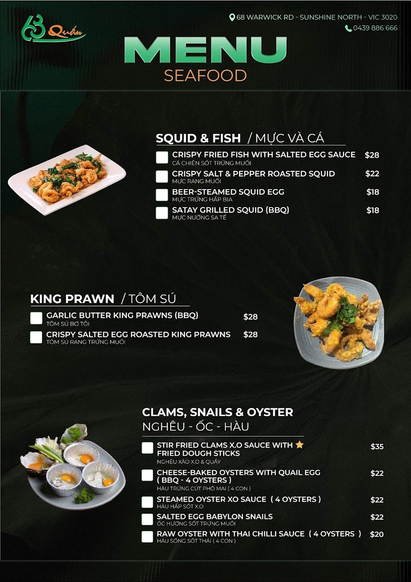 - Snack & Beer Menu: This section features a variety of traditional Vietnamese snack items, including seafood options such as raw oysters with Thai chili sauce, steamed and grilled squid, as well as chicken feet prepared in multiple styles. Other items include crispy fried capelin and salted, peppered roasted chicken ribs. These dishes are well-suited for light bites or casual sharing alongside beer.